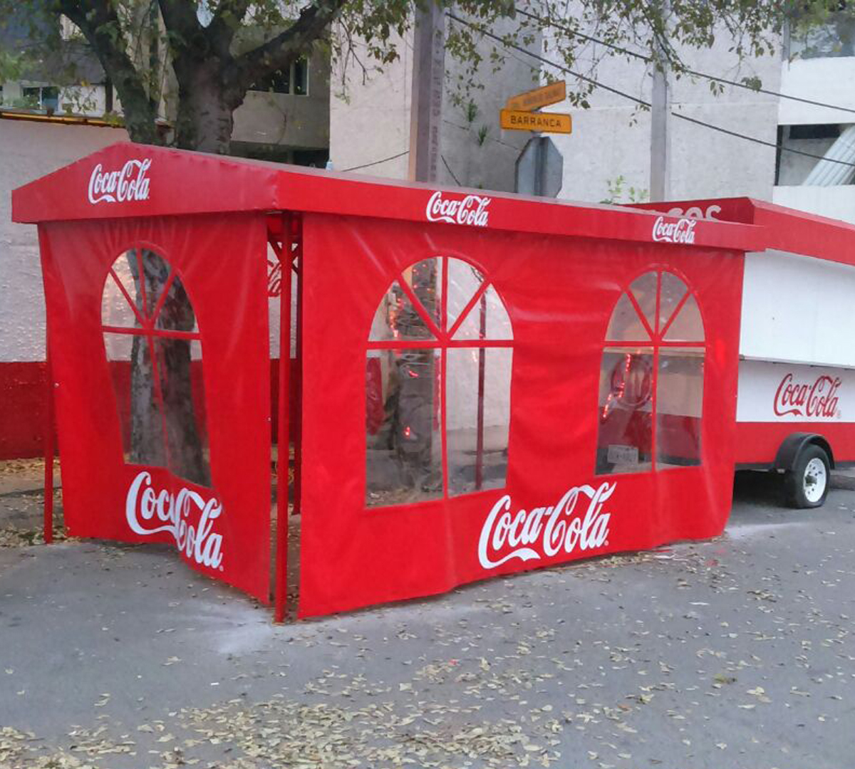 Utilizados para restaurantes, eventos o puntos de venta, puede fabricarse con tu imagen impresa, cortinas transparentes o impresas y piso de pasto artificial.
